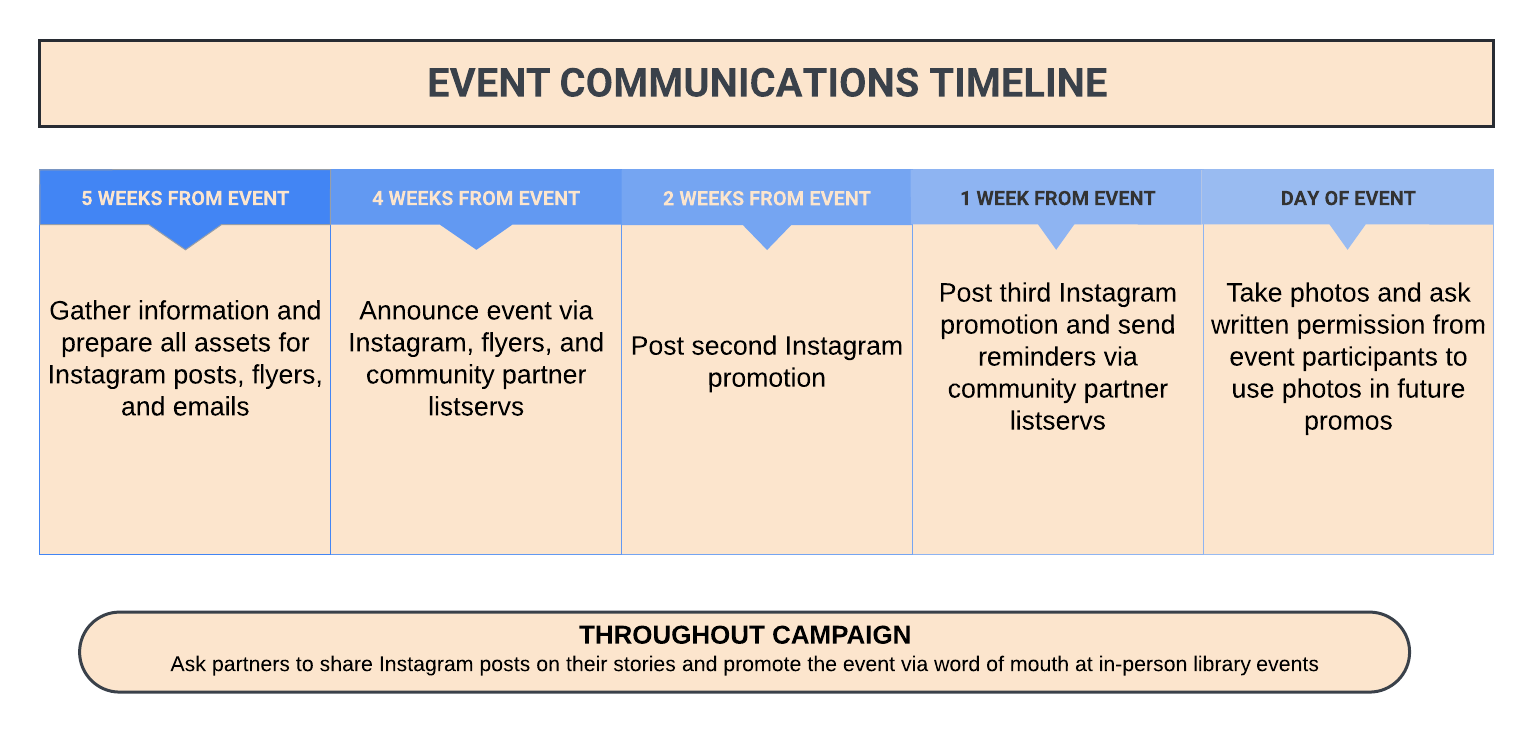 The ELPL Communications Specialist is only responsible for posting assets created by the Community Engagement Coordinator to the ELPL Instagram and in person at the library (i.e. flyers) in order to remove the majority of labor from the community partner