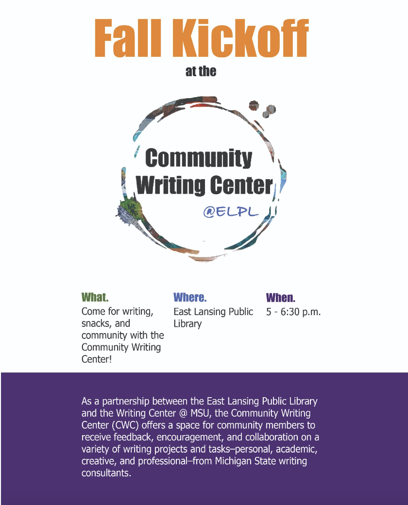 The Community Writing Center (CWC) is a partnership between the MSU Writing Center and the East Lansing Public Library. It is a space for community members to receive feedback, encouragement, and collaboration for any type of writing that they would like to bring in. The values that the CWC emphasizes in its mission statement are accessibility, community, and innovation.