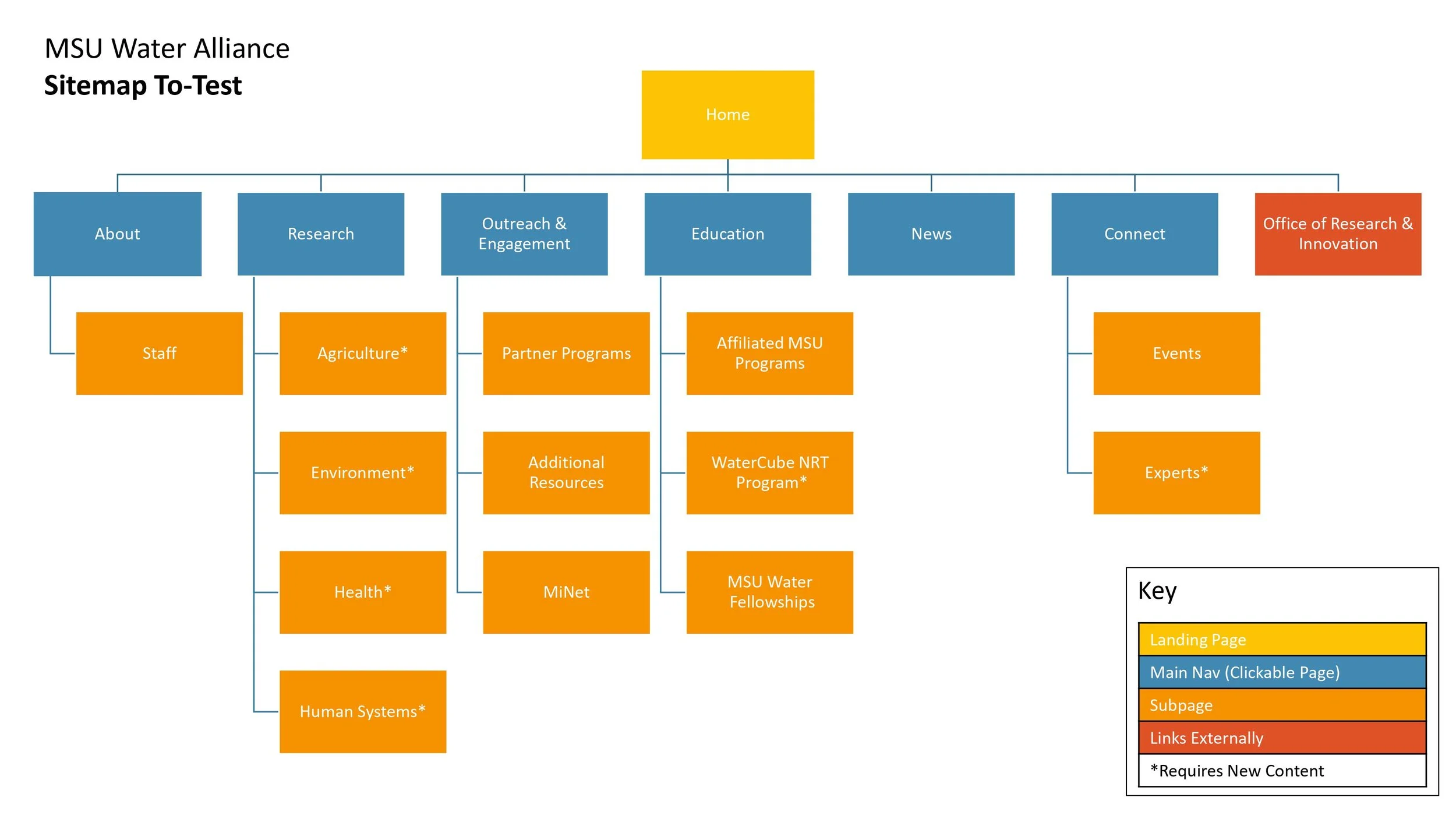 The Water Alliance was growing in its visibility and recognition by the university’s administration, but its website was not serving its purpose as the primary public-facing source of information on the Alliance. Though its purpose was to attract faculty, students, and administrators to learn more about the Alliance and how to get involved, the website lacked robust and user-friendly information architecture, and wasn’t leveraging the Alliance’s latest accomplishments to create interest in its work. Additionally, as a small offshoot of the Office of Research and Innovation website with just a few pages of text and links, the site was difficult to find, did not have its own primary navigation, and did not contain specific information about the research, education, and outreach initiatives that the Alliance facilitates. The goal of this project was to develop a new information architecture to build a new website with its own domain.