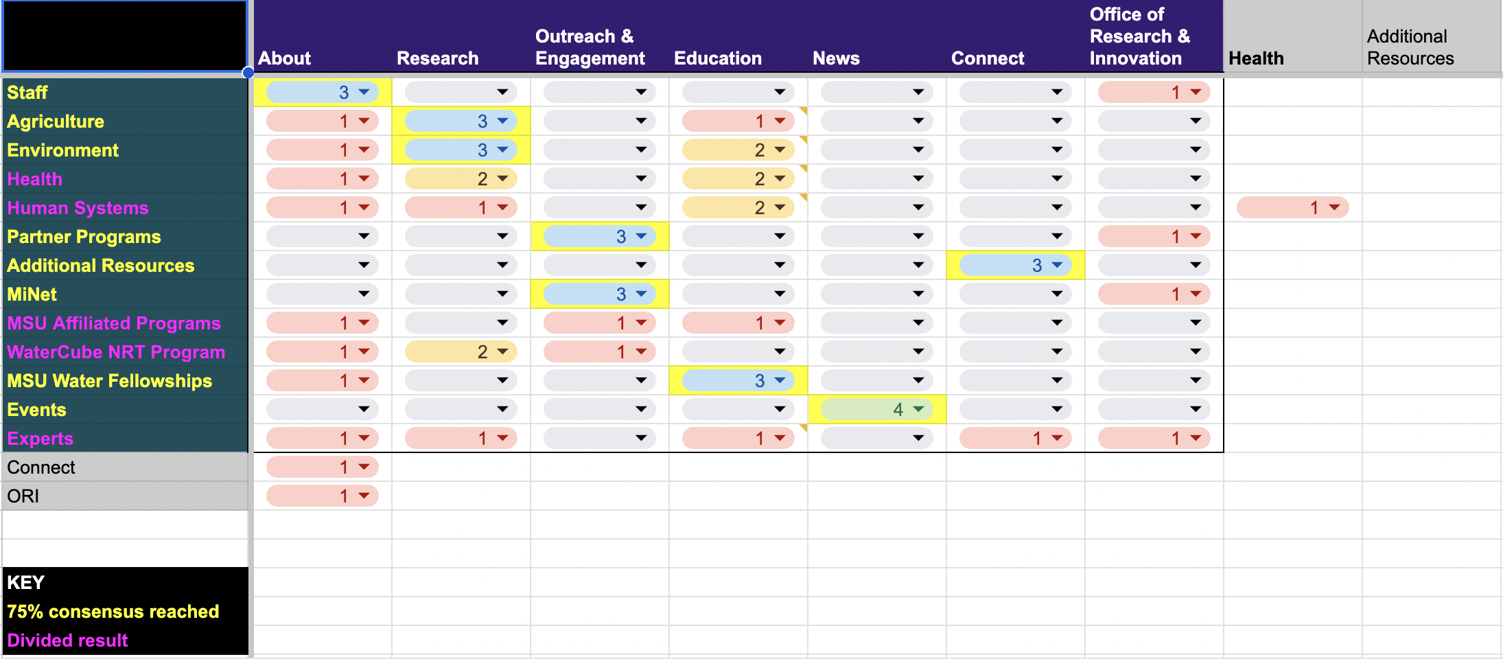 Identifying comparable sites: we analyzed MSU Institute for Global Health, the University of Maryland Global FEWtures Alliance, and the Cleveland Water Alliance. The first two were interdisciplinary networked organizations working toward solving global problems, both within BIG10 universities, which is similar to the structure of the MSU Water Alliance.The Cleveland Water Alliance provided a sense of how a similar organization’s information architecture might look when not confined to university brand standards.