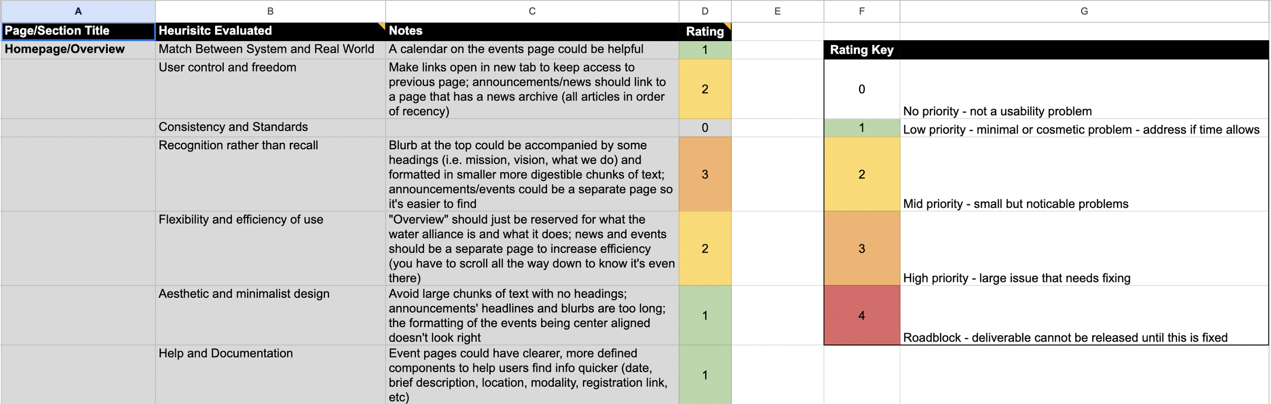 Sample of the heuristic evaluation spreadsheet we used to audit the site