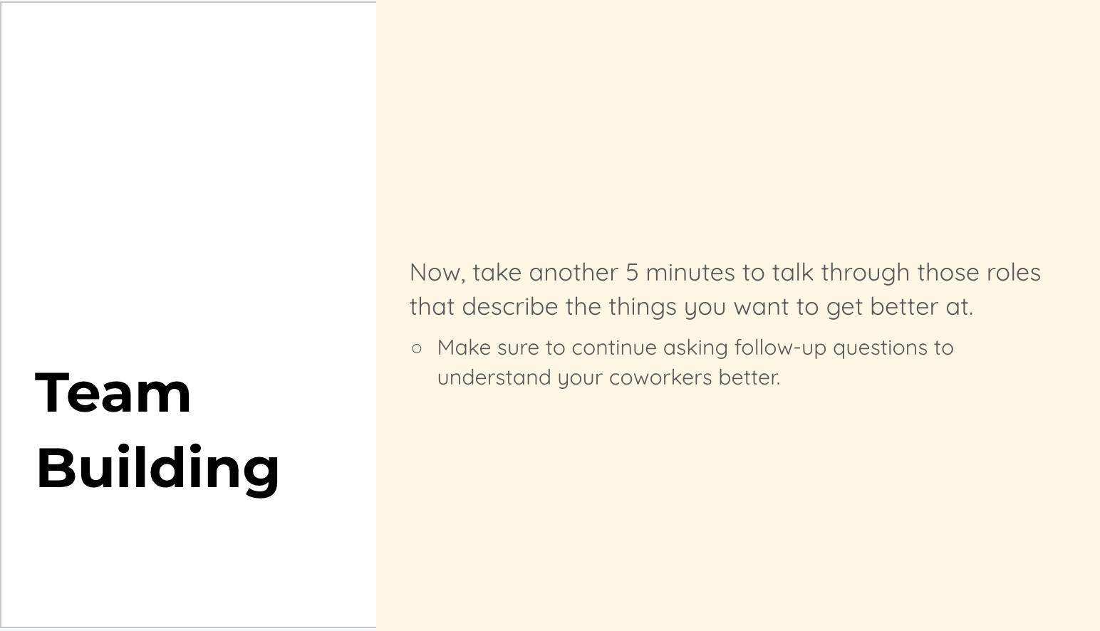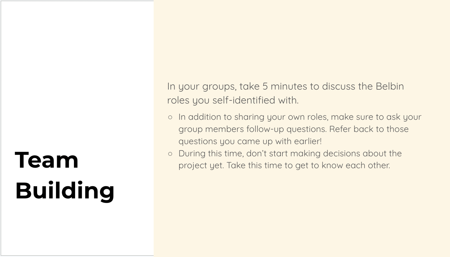 Identify priorities: I knew students needed to leave knowing, at minimum, who their team for the project would be, who would be taking on which roles on the team, and what their shared expectations for the projects were. They also needed to understand the basic functions of the Notion task management template.